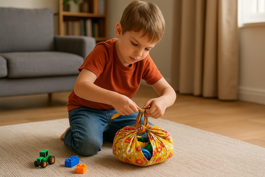 Ask kids to turn a large furoshiki into a tote bag and carry their toys around. This develops spatial awareness, folding skills, and a sense of independence.