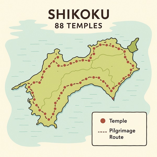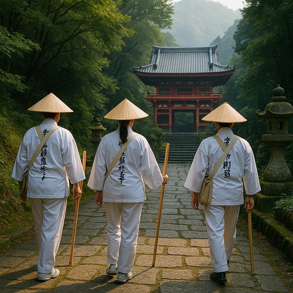 The Shikoku Pilgrimage, known as "Shikoku Henro" in Japanese, is a circular route that connects 88 Buddhist temples across the island of Shikoku. Spanning over 1,200 kilometers, it traditionally takes 30 to 60 days to walk. Pilgrims, called ohenro-san, often wear white clothing, straw hats, and carry a wooden staff inscribed with the phrase "Dōgyō Ninin" ("Two traveling together"), symbolizing that they walk with the spirit of Kūkai (Kōbō Daishi), the founder of Shingon Buddhism.